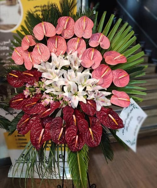 - آنتریوم صورتی و قرمز تیره: در طبقات بالا و پایین، گل لوکس با رنگ متضاد و بافت براق